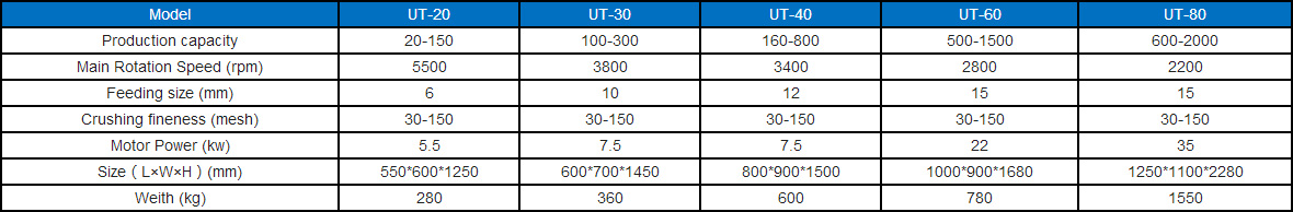 This turbine pulveriger mainly used in pharmaceutical, chemical, food ( such as: griger, chilli, peper, oil and wheat, soybean, vegetables) in the crushing process low hardness, fineness of 30-150 mesh adjusted between high output yield, fine grain size, low noise, low energy consumption, simple maintenance, and easy to intall, especially for oily, viscous, heat-sensitive, fibrous materials such as low hardness crushing process.