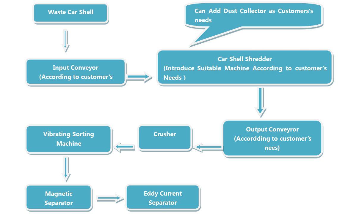 This processing diagram is used for the waste car shell crushing and sorting. It can be adjusted according to customers’ actual condition.