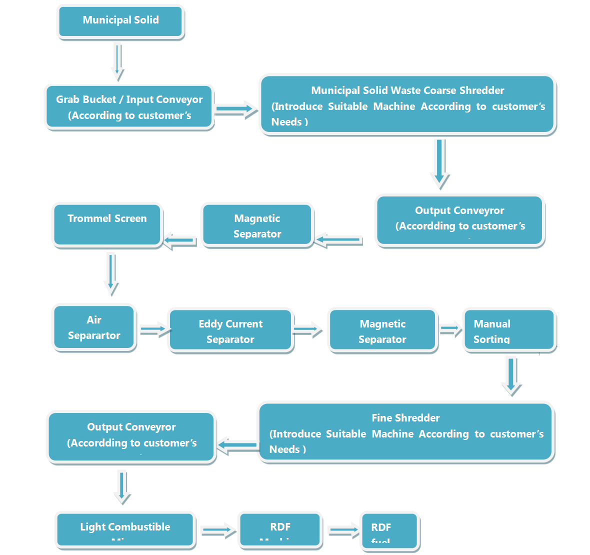 The final material is less than30- 80mm to be made of RDF (refuse dervied fuel). And sorting the iron, cooper, alumina, etc metals (recyclables), glass, ceramic, stone and sand non-combusible materials (landfill).